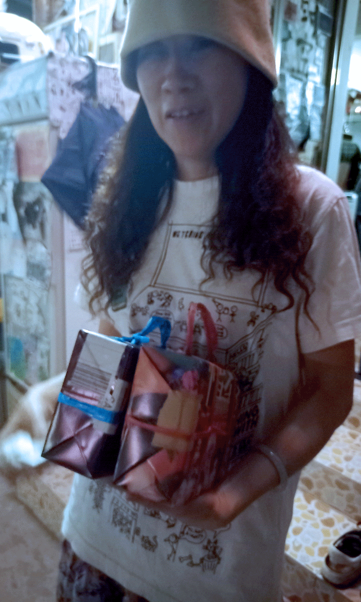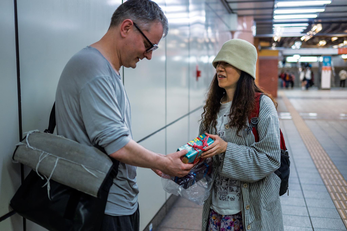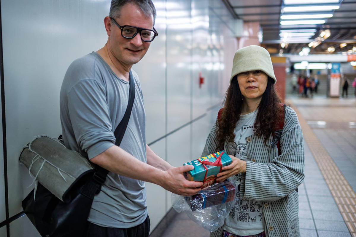 Mr. and Mrs. KUAN hastily make an exchange with The Dashing Soliloquist near exit 1 of Lung-Shan Temple station, described by COURIER The Dashing Soliloquist as, "leading to an area in Taipei City where the underprivileged reside. Immediately beyond the exit, the homeless and vagrants can be seen sleeping rough by the roadside with their bedding; streetwalkers solicit customers in the alleys of the night market; disabled individuals sell chewing gum from stalls by the roadside. This designated impoverished district is a government-planned zone, thus lacking any sense of natural or open development." As Mr. and Mrs. KUAN are headed to the airport themselves this very evening, they report: "Unfortunately, we didn't have time for a longer conversation", but handover of four big copies of 『CATALOGUE』in exchange for 5 small copies each of 《Melon》successful, the former headed to the Netherlands, and the latter headed to Hong Kong