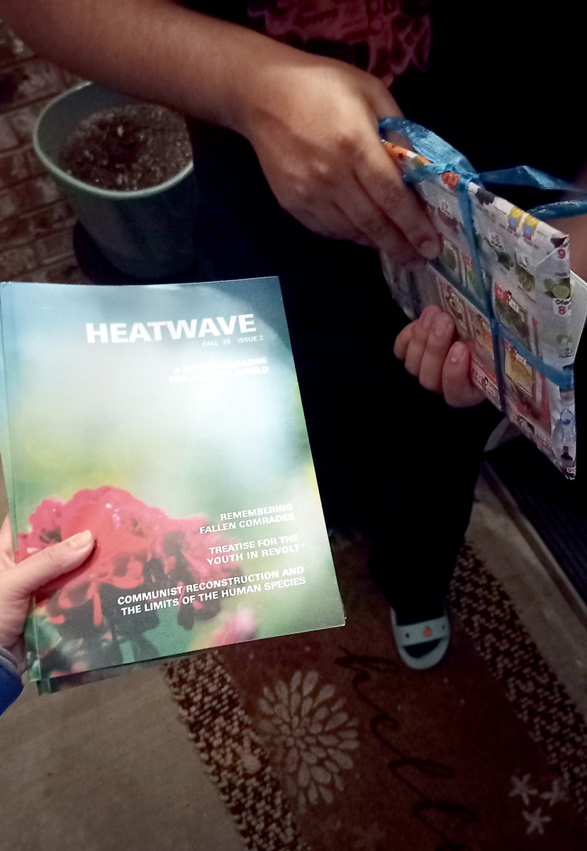 It's the last possible moment, but since COURIER PORTABLE does not have many contacts in this region, she makes a last-ditch attempt with the one person she meets before leaving Dallas the next day; it's a blind meet-up with POST, whom she has had previous online contact with in regards to Heatwave, a new leftist periodical that will join the Display Distribute distro soon. Handover meeting conversation revolves around undocumented family life, violent tactics of the Dallas police, and lonely, leftist publishing. While POST also currently lacks New York-bound contacts, he is kindly willing to assist in holding the dispatch until a relay is found; dispatch HQL-777 now in holding, relay awaiting.