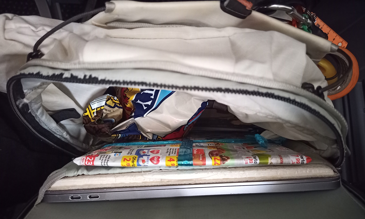 緩件號HQL-777藏在隨身行李中,旁邊還放著半包「海盜寶藏」零食 Dispatch HQL-777 tucked away in carry on luggage with half a bag of Pirate Booty snacks