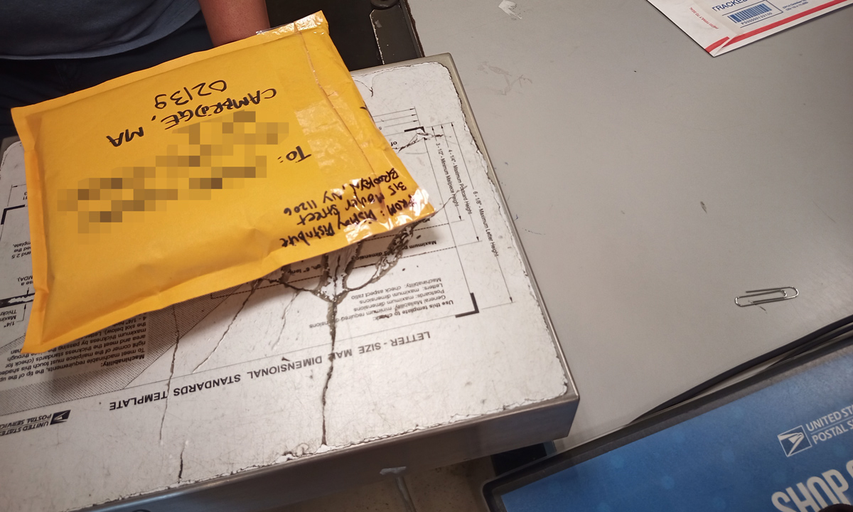 RECEIVER pays US$11.92 for regular ☹︎ postal service for dispatch HQL-795, but in the mean time, COURIER PORTABLE has already travelled from New York to Dallas, relaying the dispatch with her; in Dallas, she discovers that even though the shipping cost is now greater than the cost of the book as well as more than the amount RECEIVER has paid for New York to Cambridge, but decides to send through anyway; while trying to take a photo of the postage stamped package, the postal worker immediately snatches it away, forbidding photography: "No ma'am. Once it's in our possession it's considered our package until it's not."
