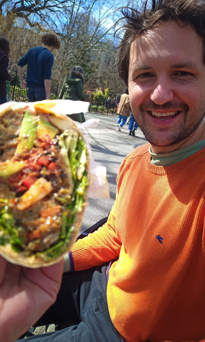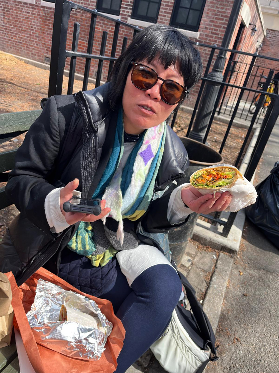 RECEIVER and COURIER PORTABLE meet one more time before his flight back to Switzerland, this time sharing a very complex tasting vegetarian wrap from an East Village deli along with a cinnamon bun in the sunshine of a just becoming sunny day in Thompkins Square Park; conversations mill around the fluctuating feelings towards the United States, the political incorrectness of Fluxus in the current atmosphere, and hopes for more meetings in other places; around one hour later, PORTABLE sends RECEIVER off in an Uber headed towards Penn Station, where RECEIVER will take the train to Newark Airport