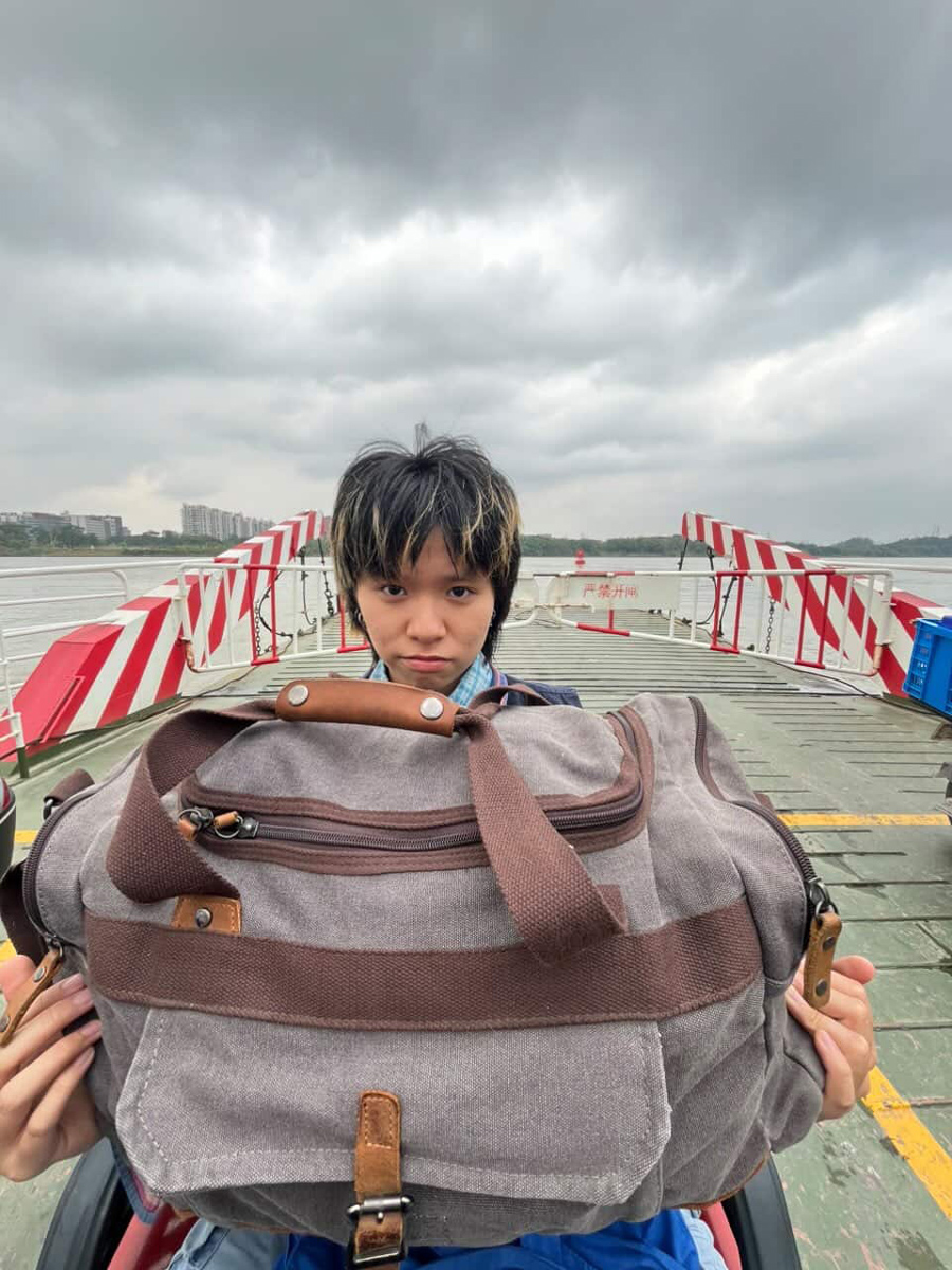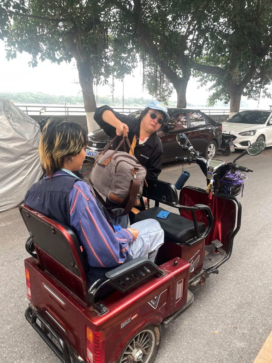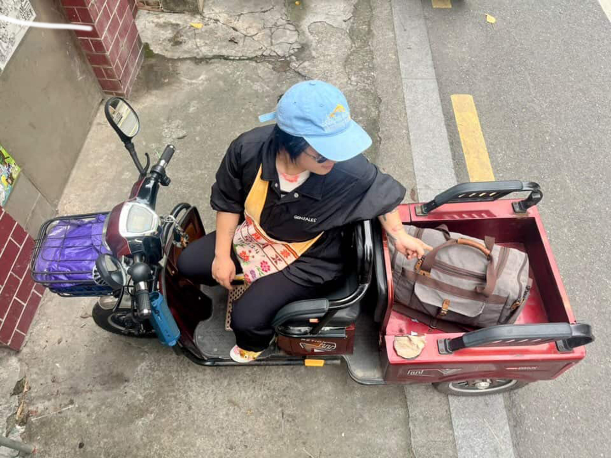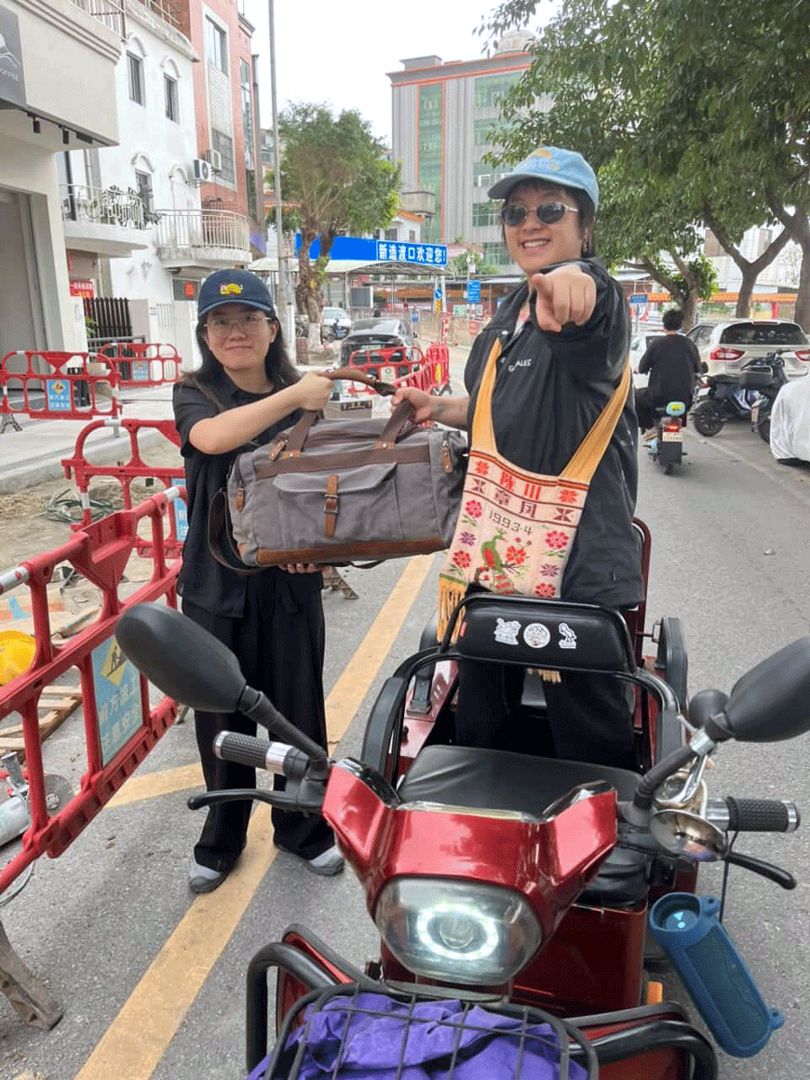 What at first is put into a medium-sized IKEA bag is transferred by COURIER Li'l Miao Baby into a canvas duffel bag, and since it's a long (and fun) scooter journey to Xinzao, COURIER Fridge Sticker joins, and after a successful meet-up the three visit the art space together; all are moved to tears