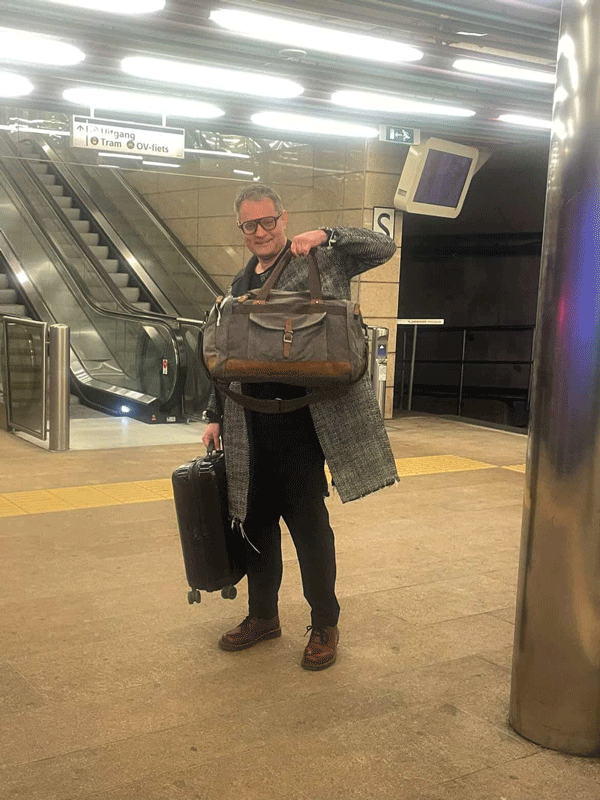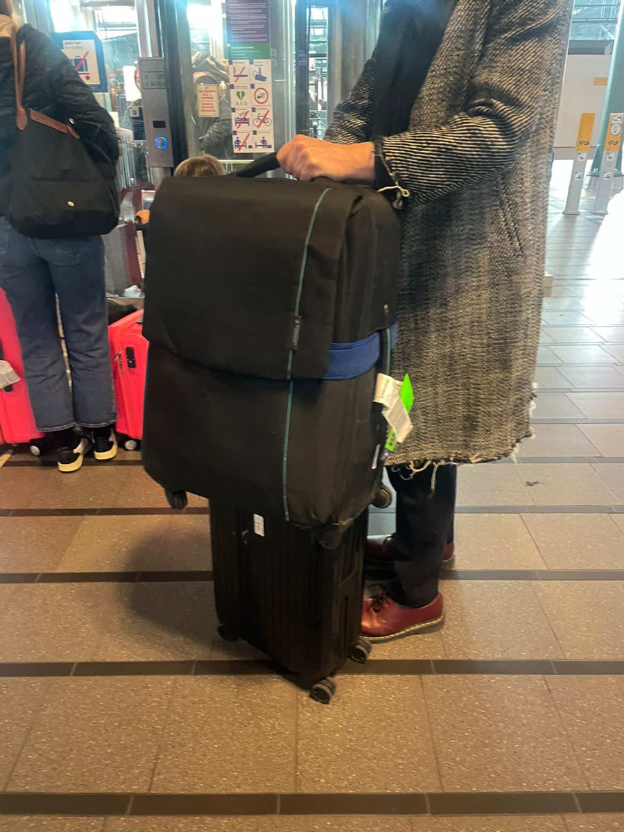 After finally leaving Schipol, LIGHT LOGISTICIAN Mr. GUAN and COURIER Tianyi take the train together and arrive back in Rotterdam; the canvas duffel bag of HQL-799 emerges from one of the suitcases