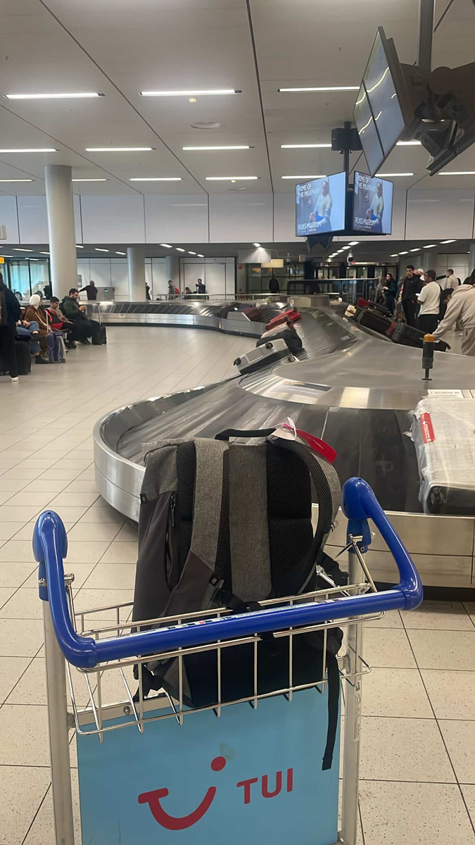 「還在等行李,可惜我這方面總是不太走運」 “Still waiting for the luggage, sadly I don’t always have luck with it“