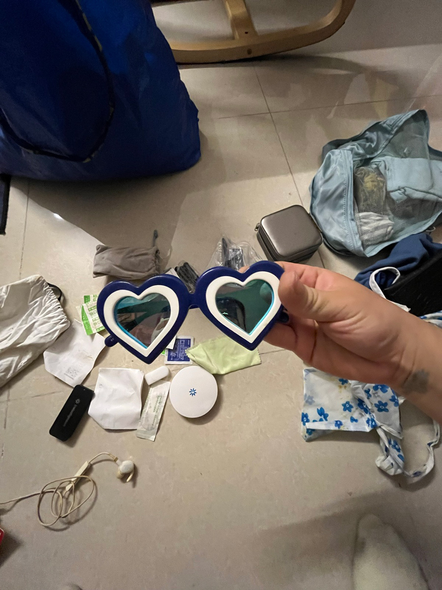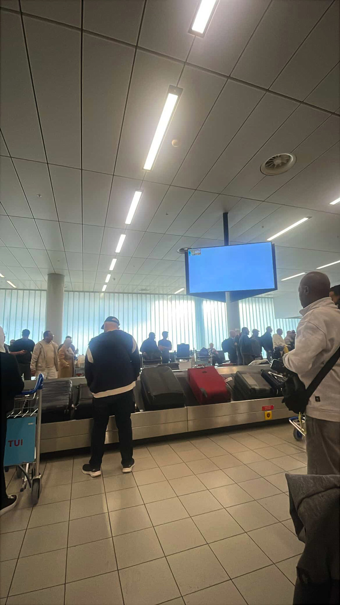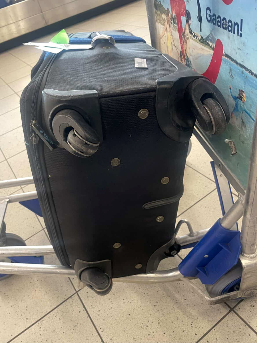 官先生抵達機場後,在4號/G4號抵達閘口等候天依領取她的兩件託運行李;將近一小時後,發現行李箱在運輸過程中有一整顆輪子被撞掉,導致進一步延誤;隨後進行一項簡短的行政程序,但官先生始終非常耐心
