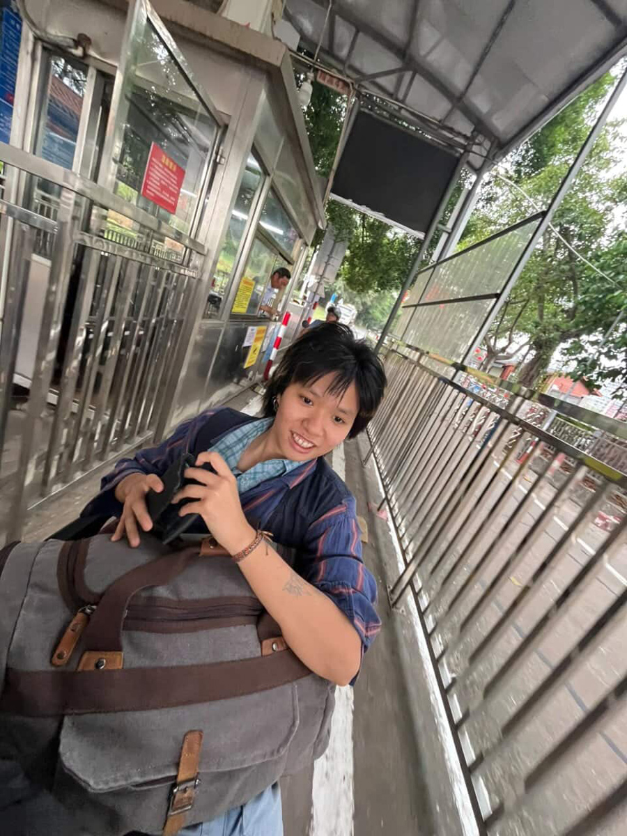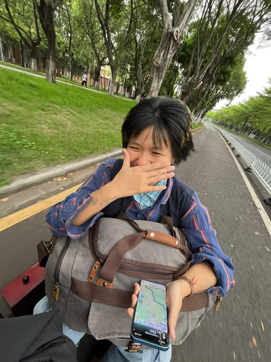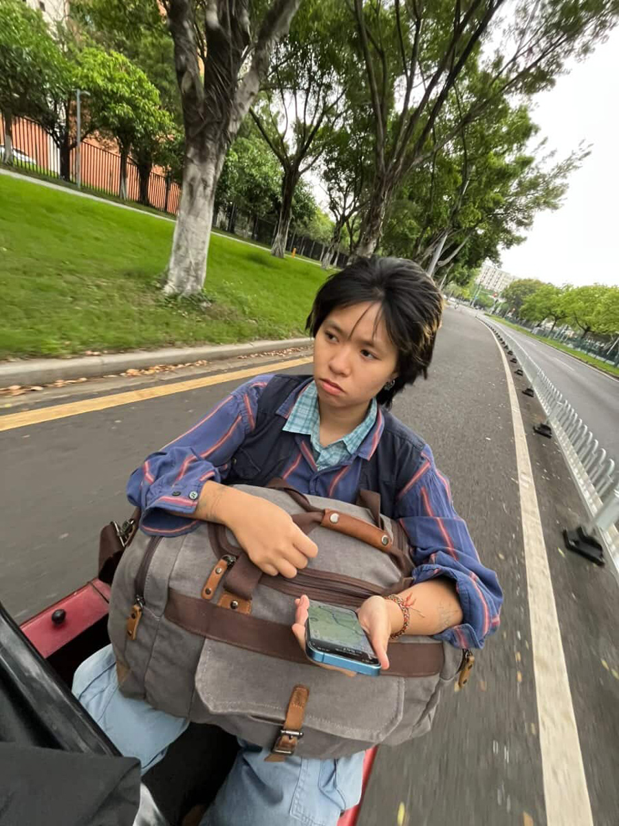 慢遞員天依神祕地抵達廣州白雲機場,隨身攜帶兩個行李箱和一個背包,卻沒有帆布郵差包